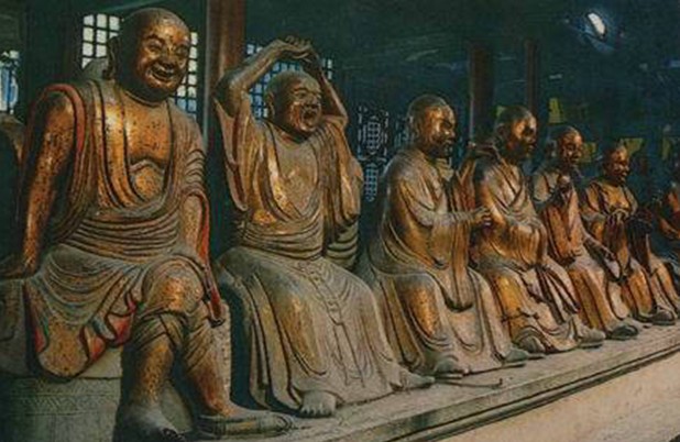 中國漢地佛教尊崇五百羅漢是從五代時(shí)開始的。當(dāng)時(shí),吳越王錢氏在天臺(tái)山方廣寺造五百銅羅漢。顯德元年(954年),道潛禪師得吳越錢忠懿王的允許,在杭州凈慈寺創(chuàng)建了五百羅漢堂。宋太宗雍熙二年(985年),造羅漢像五百一十六身(十六羅漢與五百羅漢),奉安于天臺(tái)山壽昌寺,從此各地大寺院多建五百羅漢堂。關(guān)于五百羅漢的名號(hào),五代時(shí)《復(fù)齋碑錄》有關(guān)于天臺(tái)山石橋寺五百羅漢的名號(hào),今已不存。另有南宋紹光四年(1134年)工部郎高道素所錄江陰軍《乾明院五百羅漢尊號(hào)碑》,將五百羅漢一一起名造姓。佛教研究者認(rèn)為,碑中所舉五百羅漢的名號(hào)毫無典據(jù),是宋人附會(huì)之談而已。但此后,凡寺院建五百羅漢堂,皆援用其名。