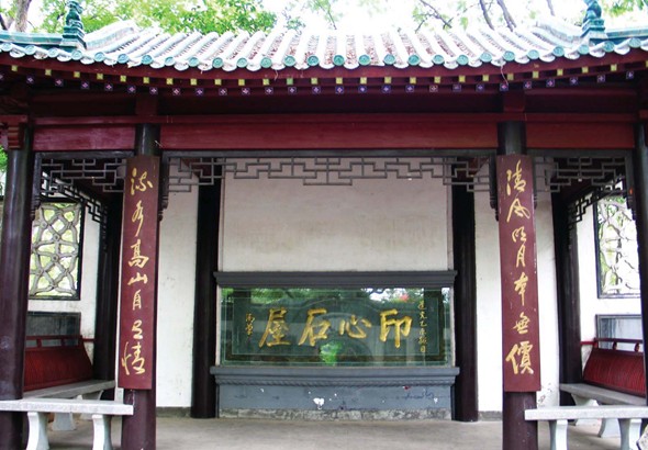 到游覽,進大門,過小院,出茶院右門,迎門是置于黃瓦紅柱內(nèi)的清道光皇 帝御書“印心石屋”照壁,用陰陽筆法刻鐫而成,遠看凸突而出,近看凹陷而入。照壁東側(cè)有一小門,門額“琴臺”二字,據(jù)傳出自北宋著名書法家米芾之手。再往前便是琴堂,又名友誼堂,是一棟半檐歇山頂式前加抱廈的殿堂,面寬三間,四周回廊,磚木架屋,釉瓦蓋頂,彩畫精麗,金碧輝煌。檐下匾額上書“高山流水”四字。