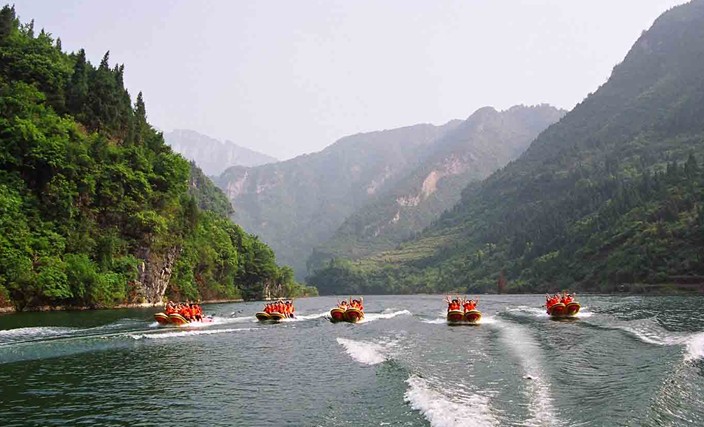 2003三峽大壩蓄水后,九畹溪漂流分兩段,上段6.8公里驚險刺激的探險漂,下段6.4公里的休閑觀光漂,高峽平湖相間,奇峰秀水爭艷,暢游其間,愜意無限。宏偉的三峽大壩、雄渾的崆嶺險灘、威武的將軍巖,將一解峽江山水的雄奇與秀美;壁立的問天簡、滄桑的巨魚坊、神秘的古懸棺,一展巴楚文化的神韻。