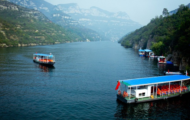 為青天河景區(qū)之精華。既有一川碧水之靈秀,又具幽谷深峽之奇觀,其兩岸林泉之美 ,峰巒之秀、洞壑之深、煙霞之勝實(shí)屬罕見,故有 “ 北方三峽 ” 、 “ 桂林山水 ” 之美譽(yù)。大泉湖長 7.5公里,寬80 — 100米,水深60余米,呈現(xiàn)出峽谷一線青天,煙波浩淼,巍巍壯觀之景色,湖水主要來源于雄冠 “ 華夏第一泉 ” 的三姑泉。大泉湖中段十分酷似長江三峽中的巫峽,人稱 “ 北方三峽 ” 。長江三峽以 “ 山高、水險(xiǎn)、湍急 ” 而聞名天下,而 “ 北方三峽 ” 則以 “ 水清、水靜 ” 而聞名。乘船途經(jīng)此段, “ 兩岸猿聲啼不住,輕舟已過萬重山 ” 的感覺油然而生。有人說,青天河過于寧靜與矜持。的確,她沒有三峽的桀驁與狂放,但更多了一份三峽所沒有的輕柔與內(nèi)秀, “ 云青青兮欲雨,水澹澹兮生煙 ” , “ 山得水而活,得草木而華,得煙云而秀媚 ” ,可見明山秀水造就了這仙境般的美景。大泉湖游覽區(qū)不僅自然景觀惟妙惟肖,形態(tài)逼真,而且在這永不褪色的青山綠水間,還流傳著許多歷史典故和神話傳說,常讓人流連忘返,尋蹤追跡。主要景點(diǎn)有:九曲澗、世界獨(dú)一無二的天然長城、三娘教子、臥鷹巖、駱駝峰、立駝峰、夢筆生花、睡美人、百鳥巢、石榴峰、鯨魚灣、佛手巖等等。