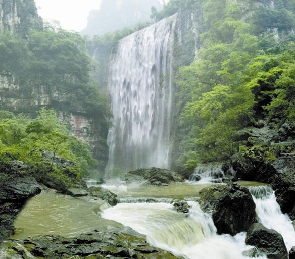 三峽大瀑布即白果樹瀑布,是長江三峽西陵峽口新辟的以飛泉馳名的旅游景點,它距宜昌市34公里,位于宜昌縣曉峰鄉(xiāng)泰山廟。在長約5公里的峽谷中,絕壁夾天,深潭無底,飛泉竟懸,一條主體瀑布和若干分支瀑布形成了氣勢磅礴的瀑布群,主體瀑布寬約數(shù)十米,清泉從百余米高的陡峭山崖飛流直下,接天連地,水天霧海,蔚為壯觀,即使久旱不雨,這里依然是飛泉不絕,被譽為“中國第四,湖北第一。”游人稱贊說:“朝游白果樹,一山日頭一山霧;午游白果樹,一身涼爽一身舒;暮游白果樹,一片晚霞一片露。”