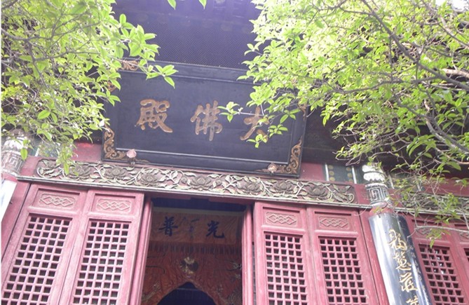 大佛殿之后,是一座懸山式建筑“大雄殿”。它長(zhǎng)22.8米,寬14.2米。殿前有一月臺(tái),是寺院內(nèi)最大的殿宇。由歇山頂改為懸山頂,面積有所縮小。殿內(nèi)貼金雕花的大佛龕內(nèi)塑的是三世佛:中為婆娑世界的釋迦牟尼佛,左為東方凈琉璃世界的藥師佛,右為西方極樂世界的阿彌陀佛。三尊佛像前,站著韋馱、韋力兩位護(hù)法天將的塑像,執(zhí)持法器。兩側(cè)排列十八尊神態(tài)各異、眉目俊朗的羅漢塑像。這十八羅漢都是用漆、麻、絲、綢在泥胎上層層裱裹,然后揭出泥胎,制成塑像,這種“脫胎漆”工藝叫夾苧干漆工藝,在國(guó)內(nèi)是獨(dú)一無二的,乃寺中塑像之精品,每座佛都是空心的,一只手即可托起。背后殿壁上還排列整齊地刻鏤著五千余尊微型佛像。大雄殿后有接引殿,為一般寺院所罕見。長(zhǎng)14米,進(jìn)深10.7米。為雙層殿基,是寺內(nèi)最小建筑。殿內(nèi)供西方三圣。中為阿彌陀佛立像,左邊為持凈瓶的觀世音菩薩,右邊握摩尼寶珠的是大勢(shì)至菩薩,均為清代泥塑。