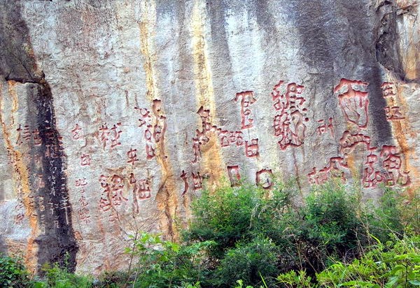 山上是一壁灼灼似火的州霞奇崖,寬約百米,高則三十余米,頗具渾宏的氣勢,遠處望去確象一壁燭天的赤城,在萬山的叢綠中更加醒目。版權(quán)所有山東聊城聊之旅國際旅行社有限公司,轉(zhuǎn)載必究!在這壁紅崖北面的一隅,數(shù)十平米的峭崖上,有若干形如鐘鼎古榴的符號,其布局蹊蹺,風格古拙,使人頓感古趣盎然,仿佛時空墜入了遠古的過去。這就是千古謎的紅崖天書!
