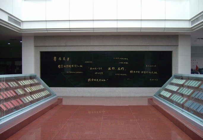 紹興魯迅紀(jì)念館“魯迅生平事跡陳列廳”本身是一座富有紹興特色和時代特征的現(xiàn)代化展館,造型簡潔平和,樸素?zé)o華,充分體現(xiàn)了魯迅精神的人文內(nèi)涵。內(nèi)部采用雕塑、不銹鋼裝飾墻面,以現(xiàn)代化展示手段加強(qiáng)了紀(jì)念館建筑的文化內(nèi)涵和藝術(shù)感染力。建筑與水景縱橫交錯,室內(nèi)外空間相互滲透,構(gòu)成了一個充滿靈氣的具有紹興特色的現(xiàn)代展館。鑲嵌在陳列廳正面墻上的“紹興魯迅紀(jì)念館”七個大字為郭沫若所題。