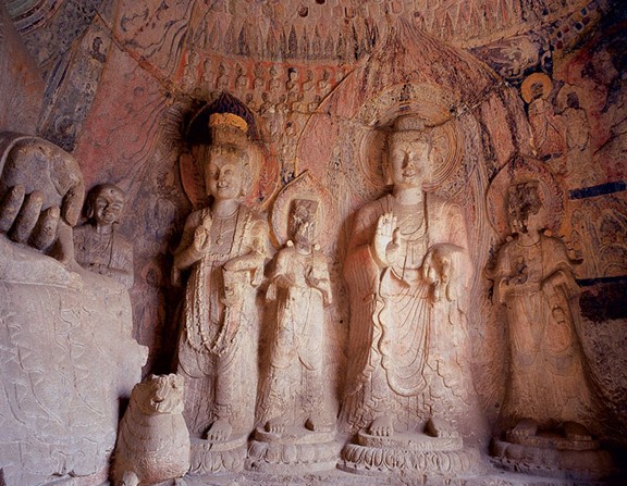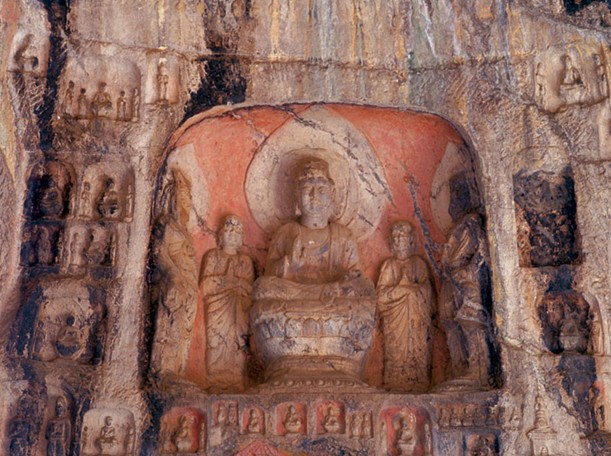 賓陽洞包括南洞、中洞和北洞,是北魏宣武帝為其父母孝文帝和文昭皇太后做功德所營造的洞窟之一。版權(quán)所有山東聊城聊之旅國際旅行社有限公司,轉(zhuǎn)載必究!其中僅中洞的開鑿就花費了24年時間,其富麗堂皇的景象是龍門眾多石窟之冠。主佛釋迦牟尼端坐中央,面部修長清秀,面容和藹慈祥,略帶微笑。迦葉、阿難二弟子和文殊、普賢二菩薩侍立左右。迦葉形象老成持重,阿難形象活潑開朗,望之栩栩如生。佛像的衣飾都由北魏早期的袒露右肩和通肩式,變?yōu)榘虏?,是孝文帝實行漢化政策在石刻藝術(shù)上的反映。洞頂?shù)裼猩徎▽毶w,周圍雕著飄逸脫俗的伎樂天人和供養(yǎng)天人。洞口內(nèi)壁兩側(cè)原本刻有三層大型浮雕,下層是著名的“皇帝禮佛圖”和“皇后禮佛圖”,構(gòu)圖嚴(yán)謹(jǐn),雕刻精美,是我國古代雕刻藝術(shù)的杰作??上н@兩幅珍品已于1934年被不法奸商盜往海外。后人已無緣得見,只能對著石壁而徒發(fā)感慨了。