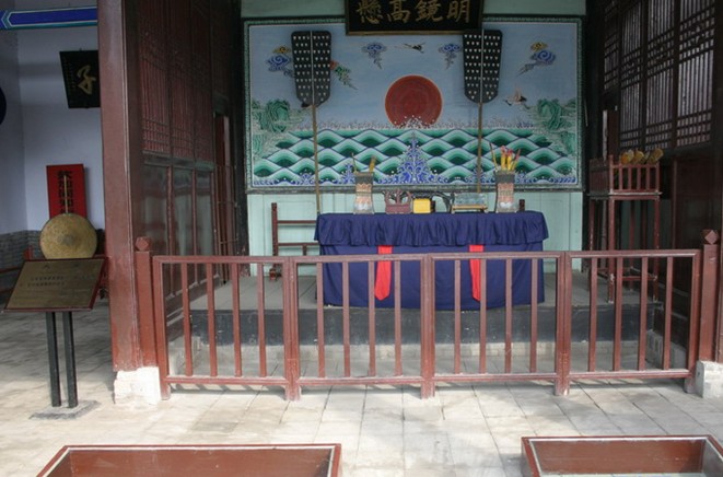 照壁對(duì)面的牌坊叫“宣化坊”,它的南面書“菊潭古治”,北面書“宣化”二字,是知縣每月的初一、十五宣講圣諭、教化百姓的地方。大門面闊三間,明間為過(guò)道,東梢間的前半間置“喊冤鼓”一架,供百姓擊鼓鳴冤之用;西梢間的前半間立有兩通石碑,上面刻有“誣告加三等,越訴笞五十”,更增加了縣衙的嚴(yán)肅性。大門是門子打更報(bào)時(shí)、監(jiān)管進(jìn)出人員的第一道防衛(wèi)之門。我們進(jìn)大門后,現(xiàn)在看到東邊的建筑叫寅賓館、衙神廟、三班院,西邊建筑是膳館和國(guó)內(nèi)僅存的清代監(jiān)獄。從大門到大堂百米甬道的中央有道門,叫儀門,是官府的第二道門。中間的大門過(guò)去時(shí)常不開(kāi),只在新官到任的第一天或迎接州、府官員時(shí)才可打開(kāi);儀門東西兩邊還各有一個(gè)小門,東邊的門叫生門,過(guò)去時(shí)常開(kāi)著,供人們的日常出入,西邊的門叫“死門”,又叫鬼門,當(dāng)犯人被判處死刑之后,從西門拉出去行刑,所以舊時(shí)處決犯人叫走西門或上西天。