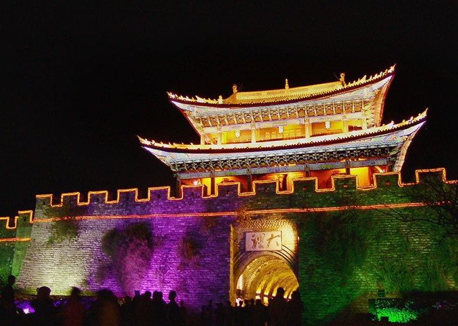 大理古城簡稱葉榆,又稱紫城,其歷史可追溯至唐天寶年間,南詔王閣邏鳳筑的羊苴咩城(今城之西三塔附近),為其新都?,F(xiàn)在的古城始建于明洪武十五年(公元1382年),方圓十二里,城墻高二丈五尺,厚二丈。東西南北各設(shè)一門,均有城樓,四角還有角樓。解放初,城墻均被拆毀。1982年,重修南城門,門頭“大理”二字是集郭沫若書法而成。 由南城門進城,一條直通北門的復興路,成了繁華的街市,沿街店鋪比肩而設(shè),出售大理石、扎染等民族工藝品及珠寶玉石。街巷間一些老宅,也仍可尋昔日風貌,庭院里花木扶疏,鳥鳴聲聲,戶外溪渠流水淙淙。“三家一眼井,一戶幾盆花”的景象依然。古城內(nèi)東西走向的護國路,被稱為“洋人街”。這里一家接一家的中西餐館、咖啡館、茶館及工藝品商店,招牌、廣告多用洋文書寫,吸著金發(fā)碧眼的“老外”,在這里流連忘返,尋找東方古韻,漸成一道別致的風景。