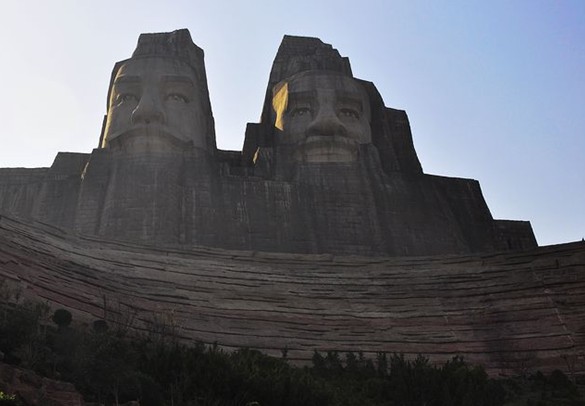 是目前國內(nèi)最雄偉的雕塑之一。它依山就勢,以山為體,82米高的整座向陽山作為像身,再在山頂塑造18米高的頭像,總高達(dá)到100米。構(gòu)思新穎,獨(dú)具匠心,不同凡響。二帝坐南朝北,背依邙山,面對黃河。巨像前是一個開闊場地,周圍遍植松柏,中間建筑祭壇。祭壇至塑像的軸線上建有長200米的神道,兩側(cè)各列四座鑄銅大鼎,連同山前一座共九鼎,寓意九州四方江山永固。廣場東西兩端擺放大型編鐘、銅鼓各一個。