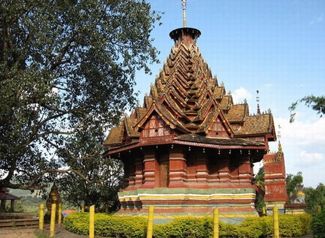 西雙版納景真八角亭為磚木結(jié)構(gòu),呈八角形,亭身有31個斜面,鑲嵌彩色玻璃,并用金銀粉印出各種花卉、動物、人物圖案,在陽光的照射下,光彩奪目。