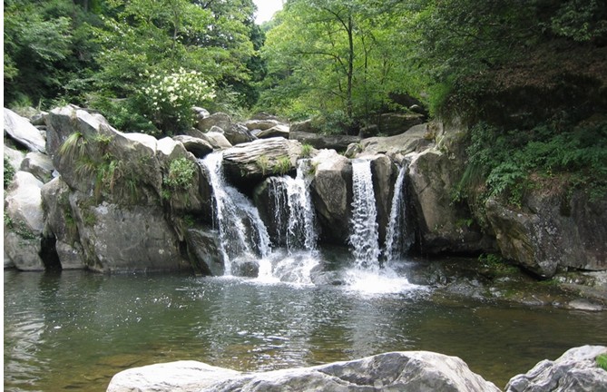 從黃龍?zhí)镀俨枷蛳伦呱蠋装倜?,然后再向西北方向溯另一小溪上行,不一?huì)兒就可到達(dá)烏龍?zhí)镀俨?。只見瀑布從幾塊巨石中奪路沖出,分成三股,只有數(shù)米高,然而姿態(tài)十分優(yōu)美。那一股股水流,跌落水中,發(fā)出婉轉(zhuǎn)悠揚(yáng)的樂音;那烏龍?zhí)端?,清澈透明,惹人喜愛。游人至此,不禁?huì)體會(huì)到“山不在高,有仙則名,水不在深,有龍則靈”的含意。