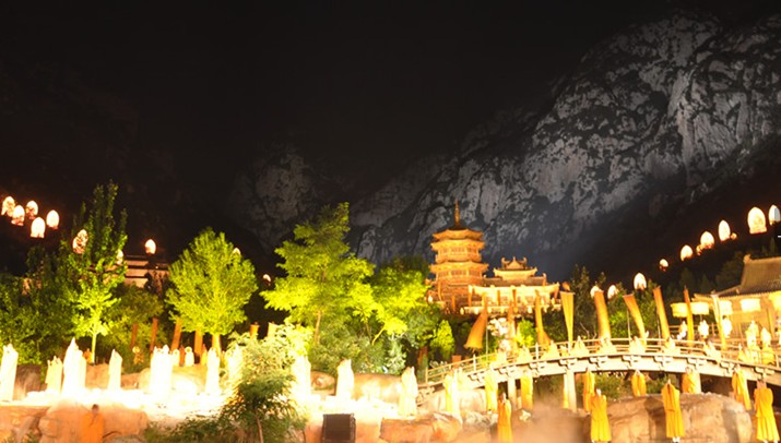 千米大佛頌和諧。在演出尾聲部分,版權(quán)所有山東聊城聊之旅國際旅行社有限公司,轉(zhuǎn)載必究!主創(chuàng)人員設(shè)計了一個特殊的章節(jié):用燈光把作為演出背景的少室山連天峰打成一尊大佛,由于距離遠(yuǎn)、面積大、山體不平整等原因,觀眾一直無緣見到這尊“大佛”,如今演出方斥資300萬元進(jìn)行科研攻關(guān),使大佛特效呈現(xiàn)。