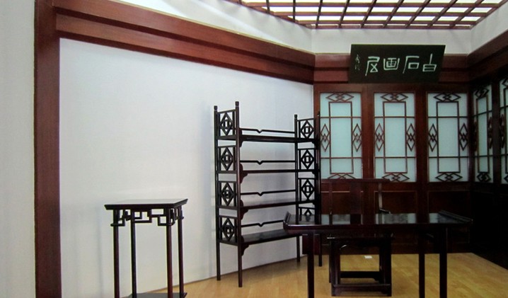 三樓展廳一進(jìn)門(mén)是齊白石先生創(chuàng)造的小魚(yú)放大的作品做背景的標(biāo)題:“草泥鄉(xiāng)里”牌匾,往后大廳中央對(duì)著門(mén)口的是齊白石先生頭像特寫(xiě)的放大作品,下邊擺一葉蘭五盆。使大廳顯得莊嚴(yán)肅穆。里邊陳列的主要是齊白石先生晚年創(chuàng)作的蝦、蟹等作品,中央有櫥窗擺放部分篆刻作品,如“白石木人”“借山館主者”“白石”“百石翁”等石章。四樓展廳進(jìn)門(mén)后大廳中央是仿真建造的齊白石畫(huà)室一 角。北墻豎寫(xiě):“齊白石紀(jì)念館”金黃紅地行楷六個(gè)大字。下邊擺放一葉蘭六盆,兩大四小。左右兩側(cè)是白石先生小幅作品,小魚(yú)小蝦等,展線(xiàn)掛的全是齊白石大師的青蛙、魚(yú)類(lèi)及蝦蟹等。向前走大廳中央小櫥窗擺放白石先生的手札及讀過(guò)的書(shū)稿等。