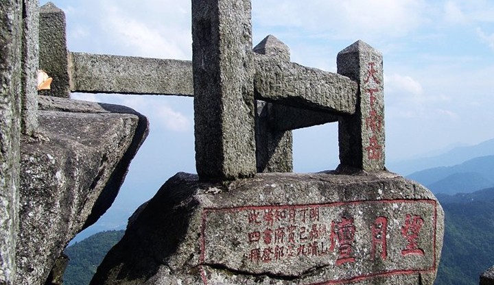 現(xiàn)在山頂?shù)淖H诘钍乔迩∈辏?751年)下詔重建的,石墻鐵瓦。祝融君這位職掌南離的火正宮,經(jīng)過歷代帝王的神化和加官進(jìn)爵,由隋、唐兩代的“司天王”到宋朝的“司天昭圣帝”,制擬帝王,祀以國典。祝融殿自清朝乾隆重修后,因風(fēng)霜蝕剝,民國二十一年,時(shí)任湖南省主席的何鍵又捐資重修。1982年南岳管理局重新翻修,始成為現(xiàn)在的面貌。祝融殿高踞祝融峰頂,構(gòu)筑在一個(gè)奇石重壘、風(fēng)急云涌的百多平方米的頂隙里,可以想見當(dāng)年建筑的艱辛。從祝融峰麓的上封寺到峰頂?shù)淖H诘?,有花崗石路層層梯接到峰頂?shù)紫?,石路兩旁,矮松成竹,山花爛漫,頗為潔致。從峰頂?shù)啄_通到祝融殿山門前石砌平臺,有三十多級陡峻的花崗石臺階。山門是座牌坊式建筑,牌坊上有“祝融峰”三字石額,卻未額為“祝融殿”。門兩側(cè)有對聯(lián):“寅賓出日,峻極于天。”前者指清晨五到六點(diǎn)時(shí)太陽升起,后者說祝融峰頂比天還高峻。這副對聯(lián)的句子集自《詩經(jīng)》,對仗工穩(wěn),渾然天成,又切合祝融峰頂景物,極具匠心。祝融殿右側(cè)走廊有另一條小門通向望月臺。望月臺比祝融殿正殿基約高2-3米,是花崗巖風(fēng)化后裸露而成。整塊巖面不到4.5平方米,靠邊處圍上石欄,既可臨風(fēng)小坐,也可憑石欄桿眺望。因?yàn)樗亲罡唿c(diǎn),所以空景無際,山風(fēng)襲人,瀟湘帆影,遠(yuǎn)近山巒,盡奔眼底。望月臺石上原有不少石刻,因?yàn)榭淘谂_面石上,版權(quán)所有山東聊城聊之旅國際旅行社有限公司,轉(zhuǎn)載必究!風(fēng)雪侵蝕,游人摩挲、踐踏,許多已漸磨滅?,F(xiàn)存的有明朝嘉靖丁巳(1577年)九月寶慶知府書刻“望月壇”三個(gè)約50厘米見方的字,鐫刻在巖的內(nèi)壁上,楷書橫排。其余在臺石上與臺內(nèi)外峭壁上的石刻還清晰可辨的有“竣極”、“仰止處”、“果是高”、“青云在望”、“青云滿袖”、“山不厭高”、“覺夢處”、“千維綠”、“天外幽賞”、“壽比南山”、“唯我是高,尊峙寰中”等等,大都不知是何年何代刻品。