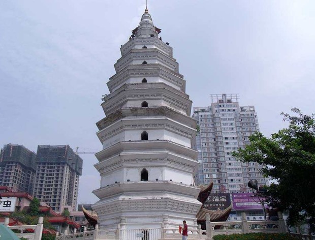 報(bào)恩塔,俗稱“白塔”,四川省文物保護(hù)單位,位于瀘州城區(qū)。建于南宋紹興十八年(1148),明弘治年間、清光緒四年、1985年三次維修。塔坐西向東,磚石結(jié)構(gòu),雙檐七級(jí)樓閣式,通高33.2米。塔身呈八邊形,層層上收,107級(jí)踏道經(jīng)塔心盤旋至頂,塔內(nèi)90龕256尊深浮雕石刻造像,人物線條流暢,栩栩如生。塔基為八邊形,邊長(zhǎng)4.1米。