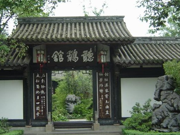 如今的草堂是在明代所建工部草堂遺址上,于八十年代重建的仿古園林建筑群。草堂內(nèi)詩(shī)圣生平館,中院宏偉的詩(shī)史堂,花木扶疏的后院。暖融融的春陽(yáng)下,幾樹(shù)海棠開(kāi)得正艷,火焰般的花朵給清靜的小院平添了幾分亮色。碧綠的荷池中佇立著一尊杜甫的全身塑像,詩(shī)人撫袖昂首,滿(mǎn)含憂(yōu)患的雙眼遙望著遠(yuǎn)方。這情景使你想起那令人不堪回首的一幕:公元770年冬的一天,杜甫在離開(kāi)四川后,終因病痛纏身,窮困潦倒而客死于湘江上的一艘小船上。"青春作伴好還鄉(xiāng)"對(duì)于詩(shī)人來(lái)說(shuō),只是一個(gè)無(wú)法實(shí)現(xiàn)的夢(mèng)……
