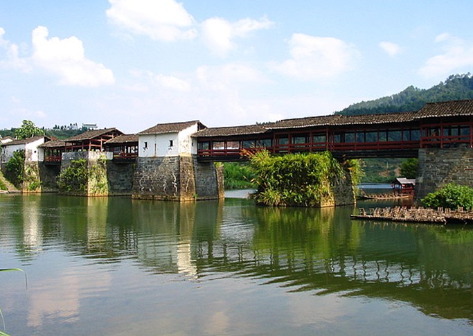 婺源有一種頗有特色的橋——廊橋,所謂廊橋就是一種帶頂?shù)臉?,這種橋不僅造型優(yōu)美,最關(guān)鍵的是,它可在雨天里供行人歇腳。宋代建造的古橋——彩虹橋是婺源廊橋的代表作。這座橋取唐詩“兩水夾明鏡,雙橋落彩虹”的意思取名。橋長140米,橋面寬3米多,4墩5孔,由11座廊亭組成,廊亭中有石桌石凳。版權(quán)所有山東聊城聊之旅國際旅行社有限公司,轉(zhuǎn)載必究!彩虹橋周圍景色優(yōu)美,青山如黛,碧水澄清,坐在這里稍作休憩,瀏覽四周風(fēng)光,會(huì)讓人深深體驗(yàn)到婺源之美。