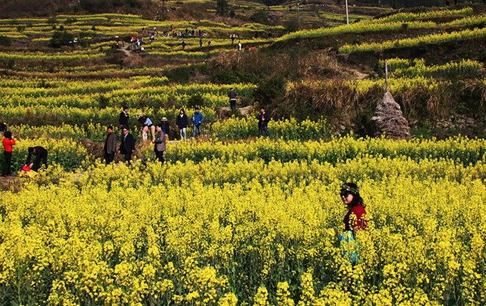 江嶺梯田隨著四季的變幻,景色也各不相同,她好似山里的大妹子,不時(shí)在用各種色彩裝飾著自己,有時(shí)顯得嫵媚、有時(shí)顯得熱烈、有時(shí)顯得奔放、有時(shí)顯得深沉……春天的江嶺,是一片金黃色油菜花的世界。初春的江嶺,天氣一會兒寒、一會兒暖,一會兒晴、一會兒雨,雖有春的感受,但卻隱約模糊。待到油菜花盛開之時(shí),就是一幅春日融融、春風(fēng)和煦的景色。層層疊疊的油菜花滿山滿野地盛開著,那菜花黃得質(zhì)樸、黃得純情、黃得熱烈、黃得坦誠。清早那油菜花的花瓣上還帶著水珠,在春日柔和陽光的映照下,晶瑩中透出嫵媚。而傍晚落日的余暉又為滿嶺的油菜花披上了一層朦朦朧朧蒙的細(xì)紗,猶如天上流云,又似一道飄落的晚霞,微風(fēng)拂過,送來一縷縷淡淡的清香。春天里江嶺梯田這一片油菜花,似一個(gè)大山中美麗的少女,她招來了蜜蜂、引來了蝴蝶、也迎來了八方游客。
