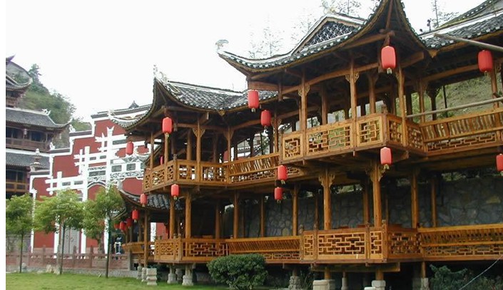 風(fēng)情園內(nèi)的建筑靈魂——九重天世襲堂 , 更是令世人驚絕,該建筑不用一鐵一釘,全部用木栓連接,堪稱我國(guó)民族建筑奇跡,版權(quán)所有山東聊城聊之旅國(guó)際旅行社有限公司,轉(zhuǎn)載必究! 2002 年 9 月 22 日,九重天世襲堂被認(rèn)定為目前中國(guó)最大、最高、最完美的木質(zhì)結(jié)構(gòu)吊腳樓,現(xiàn)已載入世界吉尼斯之最。 土家山寨,樓臺(tái)櫛比,山影湖光,竹木掩映,堪稱大湘西最富詩情畫意的吊腳樓群,擺手場(chǎng)上那擎天石柱上端坐的白虎,是土家人頂禮膜拜的圖騰,園中那高聳的石牌坊上5個(gè)行書大字——“東南第一功”,是明世宗皇帝對(duì)土家先民英勇抗倭的褒獎(jiǎng),還有那祗柱亭5根巨大的頂天木柱上的5尊人面,亦是土家族5位祖先的神雕。