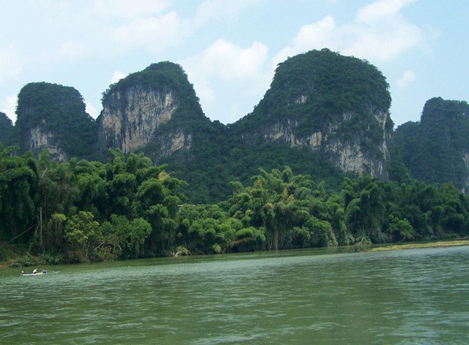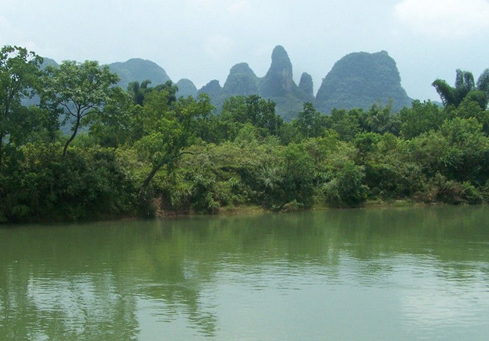 如果說桂林的山是“鳥鳴山更幽”,那么,桂林的水則是清澈透明﹑綠得欲滴。俯首看去,江水泛著細細的漣漪,玉塔微瀾,水色晶瑩剔透,加之兩岸竹林婀娜多姿,山水相映成趣,怎么看都是一幅長長的山水畫,凝重中透露著靈動之氣,真是“舟行碧波上,人在畫中游”。