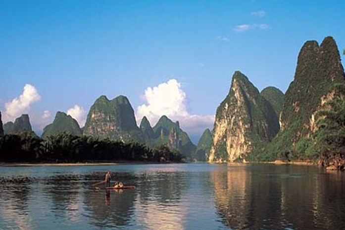 黃布倒影是漓江精華中的精華,位于漓江83公里精華段興坪古鎮(zhèn)境內(nèi),游船經(jīng)過(guò)楊堤,過(guò)了九馬畫(huà)山,江面逐漸開(kāi)闊,水平如鏡,青峰倒影,美不勝收。離畫(huà)山之南不遠(yuǎn),便是黃布灘。漓江山色之美,美在倒影中;漓江倒影之美,就數(shù)黃布灘倒影最為醉人。這里江流清澈,碧綠透底,從水面上可以看到江底有塊米黃色的大石板,長(zhǎng)、寬各數(shù)丈,恰似一匹黃布平鋪在河床之上,黃布灘由此得名。