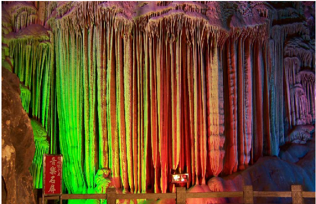 在桂林市西北7千米處的光明山上,因洞口長有蘆荻草,其可制牧笛而命名。蘆笛巖是一個地下溶洞,深230米,長約500米,最短處約90米,其游程雖比七星巖短,但景色卻比七星巖更奇。蘆笛巖內(nèi)鐘乳石,石筍、石柱、石幔,石花玲瓏多姿,景象萬千,由此所組成的雄偉“宮殿”、高峻“山峰”、擎天“玉柱”、無邊“林海”無不雄奇瑰麗,耀眼奪目,因此蘆笛巖享有“天然藝術(shù)宮”之美稱,與七星巖并列為“桂林兩大奇洞”。蘆笛洞內(nèi)景點有獅嶺朝霞、石乳羅帳、青松翠柏、盤龍寶塔、云臺攬勝、簾外云山、原始森林、琉璃宮燈、遠(yuǎn)望山城、幽景留聽等。