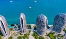 由“吉祥如意”石刻拾級而上,是古色古香吉祥鐘亭,內有一座高1.8米,重0.8噸的鑄銅大鐘,遇上重大節(jié)慶日,這里便有隆重的撞鐘儀式,祈福消災。由吉祥鐘亭向前,穿過茂林修竹,便可見仿古竹簡巨幅石刻,上刻《吉祥經(jīng)》。吉祥經(jīng)周圍布滿名家書法石刻。吉祥如意園南邊是“如意花榭”,花榭當中是一巨大天然如意石,既像一老鷹踞石,又似烈馬驚躍。偏居花榭一隅的是一座日本遣唐僧空海和尚銅像。空海大各尚西渡中國求學時,曾為臺風所阻,漂至南山,于此休整后赴長安。 三亞南山海上觀音圣像高108米,凌波佇立在直徑120米的海上金剛洲(觀音島)上。像體為 正觀音的一體化三尊造型,寶相莊嚴,腳踏一百零八瓣蓮花寶座,蓮花座下為金剛臺,金剛臺 內是面積達15700平方米的圓通寶殿。金剛洲由長280米的普濟橋與陸岸相連,并與面積達60 000平方米的觀音廣場及廣場兩側主題公園,共同組成占地面積近30萬平方米的“觀音凈苑” 景區(qū)。