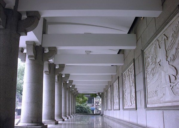 新館用融合的方法處理新舊建筑的關(guān)系,以原陳列大樓為中心,圍合前庭,強(qiáng)化兩翼,對稱布局,形成三殿式建筑,集簡練、穩(wěn)重、統(tǒng)一于一體,秩序感極強(qiáng)。