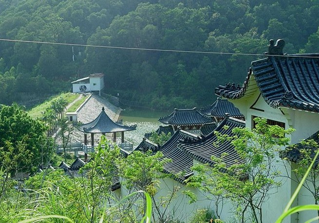 1993年5月適逢林希炎、柯紫蓉伉儷陪師宏生大和尚來寺朝山禮圣,見寺山氣魄非凡,樹林婆娑。寺雖廢而靠山雄偉,兩邊山脈宛延環(huán)拱山門,狀似龍象護(hù)寺;寺前湖泊如鏡,橫堤護(hù)基;遠(yuǎn)觀江山名城盡合眼底,美不勝收。