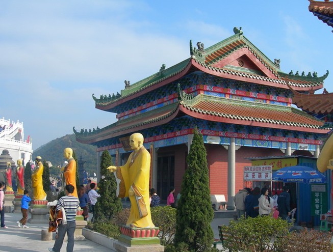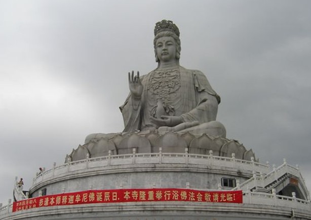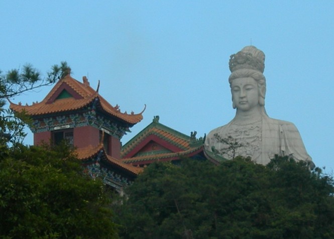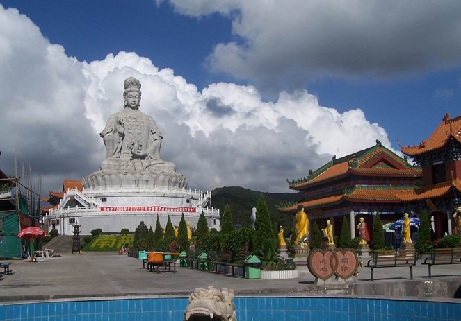 觀音廣場位于488米的觀音山頂,占地面積10000平方米,視野開闊,花繁葉茂,空氣清新,四季宜人。觀音菩薩圣像,就是目前全國乃至全世界最大的花崗巖觀音菩薩雕像。這尊觀音菩薩的圣像主題高33米,橫截面寬10.2米,體積有630立方米,總重3300噸,是由999塊0.5至8噸不等的福建蒲田優(yōu)質花崗巖拼裝而成。圣像由國家一級雕塑師陳寶如設計,全部采用人工雕鑿,從1997年9月動工,至2001年6月竣工,歷時四年,總工日達98600個。