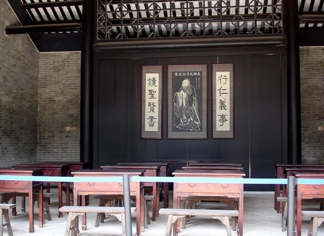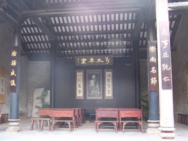 萬木草堂原為邱氏書室,建于清嘉慶九年(1804),為三間三進(jìn)、兩天井、硬山頂?shù)撵籼檬浇ㄖB祷彝餐?,兩邊保留有部分灰塑,青磚墻石腳,磚木結(jié)構(gòu),面闊三間15.8米,深三進(jìn)35.3米,面積約為663平方米。