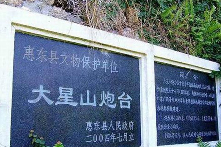 大星山炮臺位于港口鎮(zhèn)最南端的大星山西南面,是平海諸炮臺中保存得相當完好的炮臺。東、西、南三面臨海,地勢險要,易守難攻,是歷代兵家必爭之地。鴉片戰(zhàn)爭前夕,帝國主義列強不斷派兵侵略中國,為抵御外來侵略,清康熙五十六年(1718年),廣東、廣西地方軍務兼理糧餉兵部右侍郎兼都察院右副都等捐銀在此建造炮臺,筑成軍事要塞。炮臺用麻石砌筑,周長295米,平均高3.5米,寬2.55米。