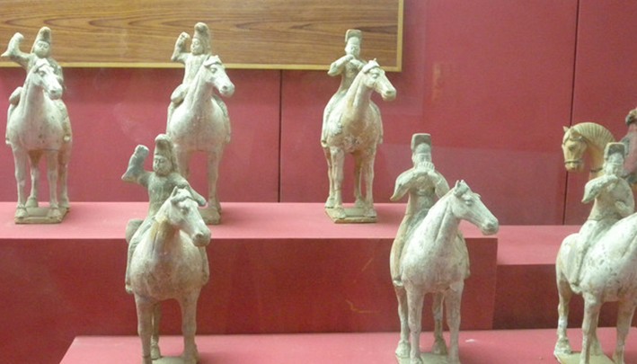 該館館藏文物4500多件,是研究初唐政治、經(jīng)濟(jì)、文化的寶貴實(shí)物資料。鄭仁泰、張士貴等墓出土的彩繪釉陶俑,是唐三彩的前身。李貞、安元壽等墓出土的唐三彩,雄渾斑爛,雍容華貴。李勣墓出土的“三梁進(jìn)德冠”,是中國目前發(fā)現(xiàn)的最古的一頂進(jìn)德冠。諸多陪葬墓出土的神態(tài)各異的胡俑和駱駝俑,反映了初唐時(shí)期絲綢之路的盛況,體現(xiàn)著初唐時(shí)期中國各民族的大融合。