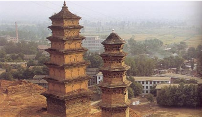 華嚴寺是中國佛教華嚴宗的祖庭。華嚴寺由初建到以后數(shù)百年間,無高大殿堂建筑的記載,而只記有鑿原為窟,以安置佛像及僧眾居住,華嚴寺可以說是黃土高原上一座典型的窟洞寺院。從塔的記載看,這里曾有華嚴宗初祖杜順坐定身骨的墓塔、二祖智儼塔、三祖賢首塔、四祖澄觀塔。但在清乾隆年間,發(fā)生了少陵原崩塌事件,僅存磚塔兩座,其余全毀。一九三0年陜西大旱,朱子橋居士來陜西賑災(zāi),與佛教界人士瞻禮華嚴寺塔時,見到元代重修碑內(nèi)有"修塔即降甘露"的文句,便于塔前發(fā)愿"重修兩塔,祝愿普雨"。不日即天降大雨,朱子橋遂與佛教界人士動工修塔。