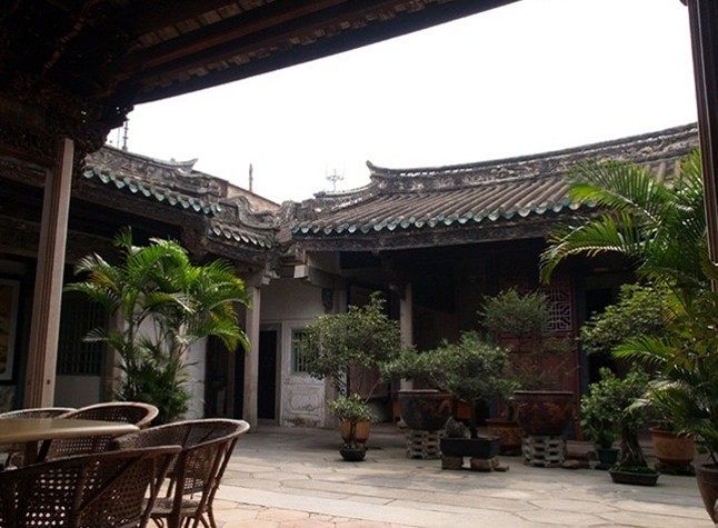 走過(guò)門樓,進(jìn)入前廳,過(guò)前進(jìn)屏門,可見(jiàn)到祠堂中央的天井,天井種有花草,一派春色盎然的景色,另有一番情趣。潮汕建筑的天井,一般不大,講究精巧和儒雅,通常擺有花盆、蓮缸,種上花草,養(yǎng)有金魚(yú),營(yíng)造一個(gè)優(yōu)雅、恬靜環(huán)境。在這種環(huán)境的潮人,他們按部就班地斟酌品味工夫茶和從容不迫地彈流水行云般的潮州弦詩(shī),陶冶儒雅的民性,保持著那種講究精致的心理,這里也不例外。