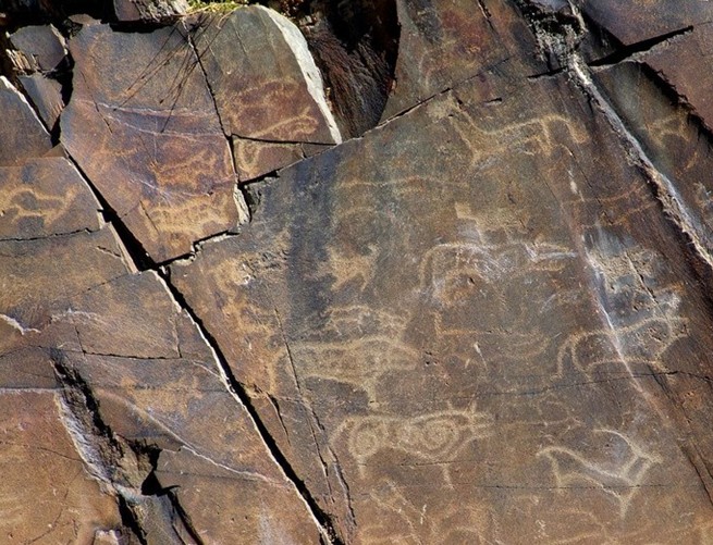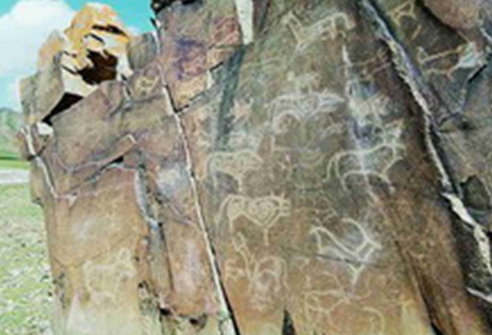 北側(cè)一處約9平方米的石塊上刻有50多個動物畫像,有牛,馬,山羊,野豬,狐貍,部分動物身上還刻有“萬”、“母”等不同形狀的紋飾,畫面形態(tài)大小不一,最長的約0.30米,高約0.20米,最小的動物長0.05米。版權(quán)所有山東聊城聊之旅國際旅行社有限公司,轉(zhuǎn)載必究!畫面形象生動,動物具有動感;在中間的一處位于第一處之南側(cè),面積約7平方米,刻有7個動物畫像,為牛羊,驢,老虎,狐貍,一般長約0.06米-0.25米,高約0.05米-0.15米;一處在最南側(cè),面積僅3平方米,21個動物畫像,以駱駝為,頭向一致,展示駱駝在沙漠里運(yùn)行的場面,此外尚有馬、牛、山羊、大頭羊、蛇等。