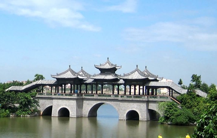 粵暉園歸水橋位于無香湖與映月湖交接的堤岸上,下設(shè)水閘,勢納東江,隨東江潮汐而變,換凈園水,永葆園內(nèi)水質(zhì)長清,故稱歸水橋。有詩為證:“橋自東江歸碧水,園從正道入青蚨”。歸水橋獨(dú)具嶺南特色,形象豐富。橋上架五亭如梅花布置,橋身用青石砌成,下由十二個(gè)大小不同的橋墩組成十五孔,平面呈“工”字形,兩側(cè)加階梯,橋面上矗立琉璃攢尖方亭五座,正中的主亭為重檐,其四角為單檐。每逢月滿,從正側(cè)橋孔觀望,每洞各映一月,金色晃動(dòng),眾月襯橋,使湖景更為美麗。歸水橋也是接通繞翠廊的關(guān)口,橋面相對前園高出3米多,這樣即使無香湖四周景觀高低起伏,又使繞翠廊有層次感,高低疊立,倚橋亭遠(yuǎn)眺,視野開闊,園內(nèi)美景盡收眼底。正是“水應(yīng)園生,園因水活”。