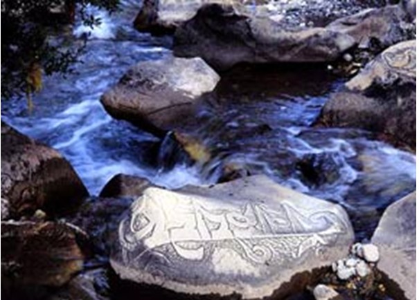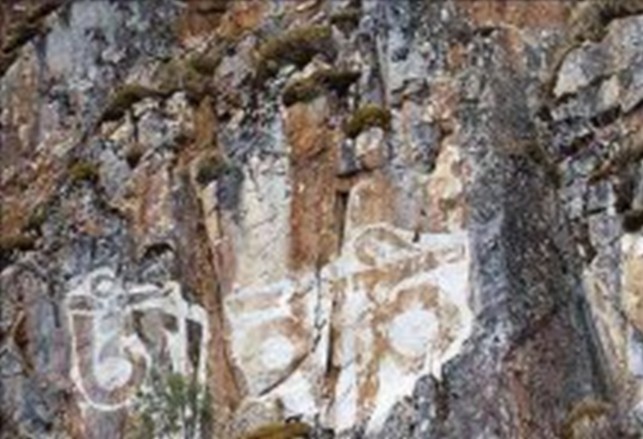 勒巴溝巖畫位于玉樹州境內(nèi)的通天河畔。沿著通天河畔的一條山徑來到這里,會使你同時產(chǎn)生兩種截然不同的情緒體驗:通天河的喧囂、壯闊和勒巴溝巖畫的靜謐、神圣。勒巴溝巖畫面江而鑿,處于勒巴溝溝口。勒巴溝內(nèi)蓊郁的草木,也難以掩蓋住由巖畫和不可勝數(shù)、遍布溝內(nèi)的嘛呢石刻散發(fā)出來的神秘氣氛。