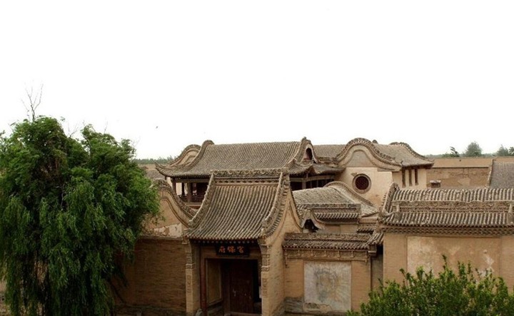 董府所在地,原是一片湖塘。湖底全部用煤炭墊起(1.5~2米厚)上面再鋪黃土。數(shù)百峰駱駝?dòng)纱鸥G堡馱炭,半年才把地基墊起。修建董府所用的木料來(lái)自甘南,沿黃河順?biāo)畔?。石料?lái)自陜西,木匠大都來(lái)自四川。故其窗門(mén)雕花頗具南北特色,做工精細(xì)。鐵匠來(lái)自包頭,石匠多為陜西。