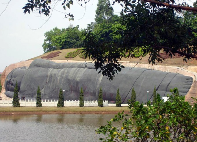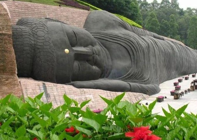 大臥佛位于森林公園天仙巖。相傳當(dāng)年佛教大師六祖惠能傳教后深夜經(jīng)過(guò)這里,看到天仙巖靈光閃爍,隱約可見(jiàn)這塊橫臥的大石塊就是一個(gè)大臥佛,六祖立即跪拜,求佛祖降福天下。大臥佛的雕造從這個(gè)傳說(shuō)獲取靈感,以盛唐敦煌臥佛為范本,佛身長(zhǎng)108米,尺度堪稱世界之最?,F(xiàn)經(jīng)改造用紫銅包裝大臥佛,成為金裝大臥佛。大佛前面是錦鯉池和荷花池,與大佛相互映襯引人入勝。大佛對(duì)岸一層為長(zhǎng)六十米的長(zhǎng)廊,廊內(nèi)彩繪佛傳故事,二層為敬佛臺(tái),憑欄對(duì)拜,大佛全景一覽無(wú)遺。