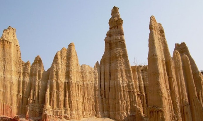 虎跳灘土林位于元謀縣城西北32公里的物茂鄉(xiāng)虎溪行政村,又稱物茂土林,芝麻土林,總面積2.3平方公里?;⑻鵀┩亮中螤钜猿潜睢⑵溜L(fēng)狀、簾狀為主,高度一般10?15米,最高27米。