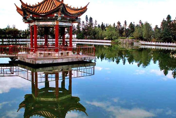 公園始建于80年代,建筑面積7畝,其中心是一泓近10多畝的水潭。池邊廣植銀樺、雪松、垂柳等,四周有藤架、大理石桌凳、大理石長(zhǎng)欄,小溪繞潭。水池西側(cè)有大理碑亭,過(guò)亭沿曲廊行數(shù)米,可達(dá)水中的漾波亭。版權(quán)所有山東聊城聊之旅國(guó)際旅行社有限公司,轉(zhuǎn)載必究!漾波亭南側(cè)有一小島,島上塑有一對(duì)栩栩如生白鶴,水中倒影,人動(dòng)影移與漾波亭相映成趣。