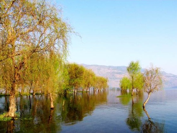 湖泊面積7.86平方公里(加西南側(cè)的草海,則為8.46平方公里),南北長6.1公里,東西寬最大2.5公里,最小0.75公里,湖岸線總長17公里,平均水深11米,最大水深32米,平均水溫14Y c湖面最低海拔2052.8米,正常蓄水位2056.2米,總庫容9322.4萬立方米(其中灌溉庫容1877萬立方米,徑流面積6如.1平方公里),湖水碧綠透明,年產(chǎn)鮮魚近百噸。湖中盛產(chǎn)芘碧花,構(gòu)成水花奇觀,“芘碧湖”由此得名。版權(quán)所有山東聊城聊之旅國際旅行社有限公司,轉(zhuǎn)載必究!死碧花屬睡蓮科,葉呈心臟形,浮于水面,莖長七八尺,扎在水底泥中,夏季開花,類似蓮蓬,多為黃白色,每天中午12時至下午4時開放,其余時間閉合為花蕾狀,清香撲鼻。先秦古籍《山海經(jīng)?西山經(jīng)》中記載:“西五十里,曰羆谷山。洱水出焉,而西南流注于洛,其中多芘碧。”這種水生花卉,在日本稱作“子午蓮”,屬珍貴植物。死碧湖背靠青山,面對壩子,環(huán)境優(yōu)美。湖北面有梨園,西而為黑谷山,山麓湖岸曾建澄碧樓和龍王廟,每年農(nóng)歷七月二十三為廟會期,沿湖群眾對歌放海燈,只見湖面海泛金波,爭奇競秀。湖內(nèi)盛產(chǎn)的茈碧花,有“水花樹”奇觀,楊升底曾撰《泛湖窮源碑》志其勝。