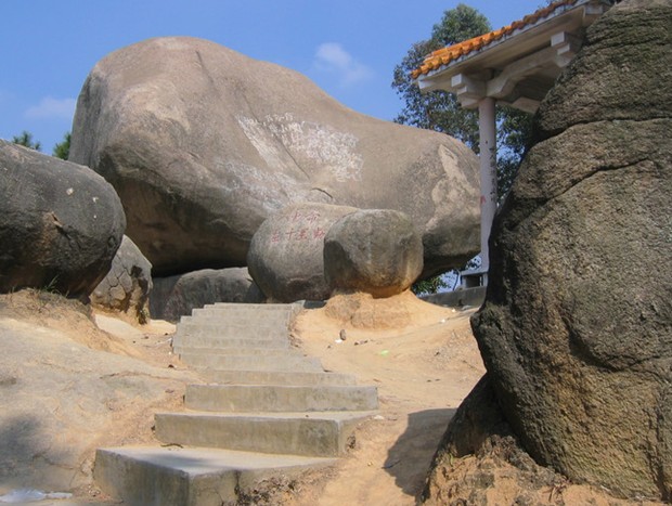 豬頭石高約5米,長6米,100余噸重,由兩小巨石頂住,仿佛凌空飛來,擱在石棱倒插的火爐山云峰山石之巔,版權所有山東聊城聊之旅國際旅行社有限公司,轉載必究!科學解釋為第四紀冰川過處的遺留物。