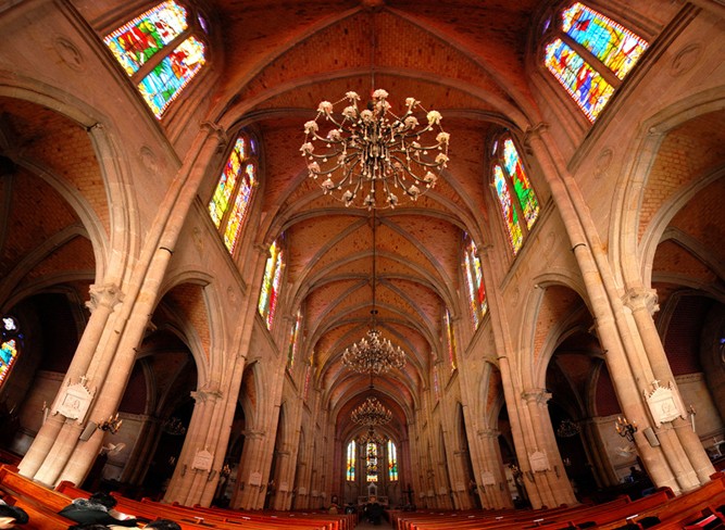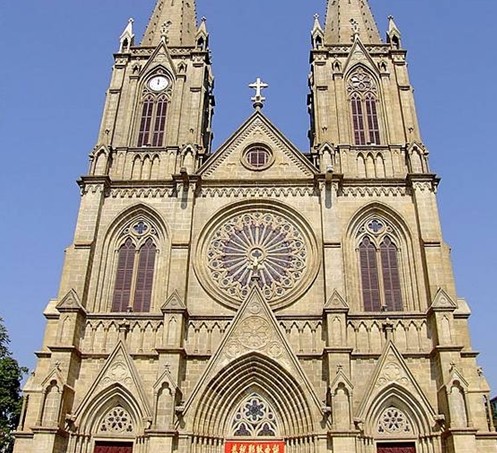 該教堂正面是一對(duì)高聳的尖頂石塔,象征升向天堂,皈依天主;石塔中間西側(cè)是一座大時(shí)鐘,石塔中間東側(cè)是一座大鐘樓,裝有四具從法國(guó)運(yùn)來(lái)的大銅鐘;西邊鐘樓的西、南、北三個(gè)塔面安裝有羅馬字鐘面的時(shí)鐘,東邊鐘樓內(nèi)懸掛著以圣母瑪利亞命名的銅鐘組;正立面的鐘樓上聳立尖塔,是哥特式教堂建筑風(fēng)格的特征,也是建筑造型藝術(shù)魅力的內(nèi)是尖形肋骨高叉的拱形穹窿;正面大門上面和四周墻壁分布的花窗欞,都是合掌式,所有門窗都以法國(guó)制造的較深的紅、黃、藍(lán)、綠等七彩玻璃鑲嵌。這玻璃可避免室外強(qiáng)光射入,使室內(nèi)光線終年保持著柔和,形成慈祥、肅穆的宗教氣氛。充分展現(xiàn):尖塔為空心的八角形錐體,用石塊砌成,其下是三層樓房,尖塔越往上越陡峭,最后像錐尖刺向蒼穹。
