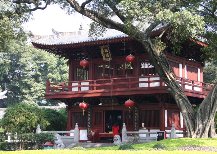 寺內(nèi)的睡佛閣,又稱風(fēng)幡堂。相傳六祖慧能初到光孝寺,正趕上寺院信持邱宗法師在講解(涅經(jīng))。當時一陣清風(fēng)吹來,佛閣頂上的旗幡隨風(fēng)飄動,印宗法師便向眾僧發(fā)問:“這是什么在動?”一僧曰:“此乃幡”。 版權(quán)所有山東聊城聊之旅國際旅行社有限公司,轉(zhuǎn)載必究!另一僧謂:“此乃風(fēng)動”?;勰苴吳安逶挘?ldquo;此乃心動”。此話一出,印宗法師隨即走下壇來,納頭使拜慧能為師。從此慧能開壇傳法,后人把睡佛閣改稱為“風(fēng)幡堂”?,F(xiàn)在堂前依然掛側(cè)巨幡,迎風(fēng)飄揚。