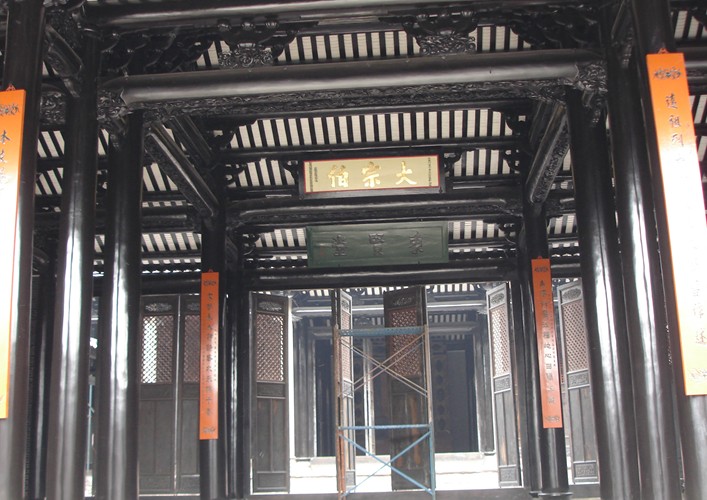 進(jìn)深達(dá)17米多,在古祠中是少見(jiàn)的,正中一前一后懸“大宗伯”、“象賢堂”兩塊紅漆金字木匾。“大宗伯”指的是沙灣燈廠第二代何起龍,明朝洪武年間任禮部尚書(shū)。禮部尚書(shū)當(dāng)時(shí)人稱“大宗伯”。“象賢堂”是紀(jì)念沙灣何氏的宗祖何德明(號(hào)象賢)而設(shè)。象賢堂由4條石柱和24條兩人合抱的大木柱支撐,梁、枋、駝峰斗拱均有玲挑剔透的三紋鳥(niǎo)獸、花果蟲(chóng)魚(yú)等復(fù)雜木雕,令人嘆為觀止。置身如此寬敞高挺的象賢堂,巨大的柱林更覺(jué)得肅穆莊嚴(yán),對(duì)前人的敬意不覺(jué)油然而生。