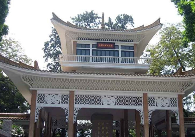 中朝人民血誼亭位于廣州起義烈士陵園內(nèi)東面,與中蘇人民血誼亭相對(duì)。建于1964年,坐南朝北。建筑平面呈“凹”字形,占地面積約3000平方米。黃色琉璃瓦,鋼筋混凝土結(jié)構(gòu)。主亭面闊三間12.85米,進(jìn)深三間13.06米,高二層,四角攢尖頂。上懸“中朝人民血誼亭”匾額。兩側(cè)各有總長為33.7米的曲尺型長廊,兩廊各連接面闊6米,進(jìn)深5.5米的卷棚歇山頂副亭,平面呈方形。