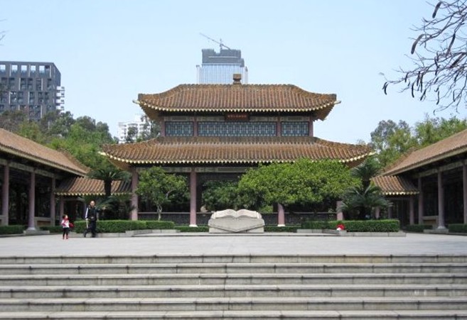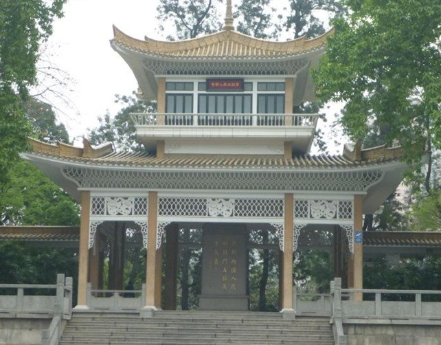 中朝人民血誼亭位于廣州起義烈士陵園內(nèi)東面,與中蘇人民血誼亭相對(duì)。建于1964年,坐南朝北。建筑平面呈“凹”字形,占地面積約3000平方米。黃色琉璃瓦,鋼筋混凝土結(jié)構(gòu)。主亭面闊三間12.85米,進(jìn)深三間13.06米,高二層,四角攢尖頂。上懸“中朝人民血誼亭”匾額。兩側(cè)各有總長為33.7米的曲尺型長廊,兩廊各連接面闊6米,進(jìn)深5.5米的卷棚歇山頂副亭,平面呈方形。中國傳統(tǒng)形式的建筑基座,帶有朝鮮民族風(fēng)格的屋脊和檐口裝飾為金達(dá)萊花和木棉花結(jié)合的圖案。亭前是水池,小橋橫跨其中。亭中心矗立著高大的花崗巖石紀(jì)念碑,碑座高0.96米、碑身高 4.3米、闊2.6米,上嵌紅棉圖案。紀(jì)念碑正面刻“中朝兩國人民的戰(zhàn)斗友誼萬古長青”, 版權(quán)所有山東聊城聊之旅國際旅行社有限公司,轉(zhuǎn)載必究!落款為“葉劍英”,題于“1964年十月一日”。背面鐫刻著著名書法家吳子復(fù)書寫的碑文,對(duì)在廣州起義中犧牲的朝鮮青年的事跡作了簡明的介紹。