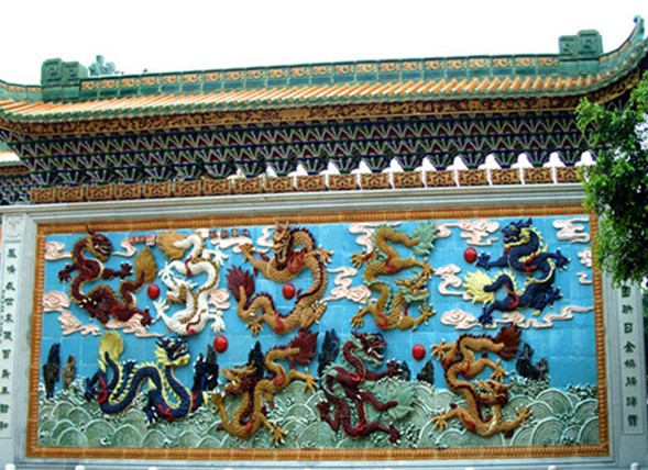 進(jìn)入南粵苑大門,迎面是一幅大型的照壁——九龍壁,這是“龍翔鳳翥”美景。九龍壁下有雕花青石底座,上有“玉包金”琉璃瓦蓋頂,四周是白玉石欄河。九龍壁有著王者氣派,顯示中華民族龍的文化源遠(yuǎn)流長(zhǎng)。為了突出龍的形象,制作者采用浮雕技術(shù)塑造燒制,很有立體感。在海水、祥云的映襯下,九條分別為黃色、紅色、紫色、白色、藍(lán)色的巨龍,喜戲龍珠,形態(tài)生動(dòng),翻騰自如,有如遨游滄海,又似騰飛九霄。特別是在陽(yáng)光照射下,熠熠生輝,色彩斑斕,華美亮麗。