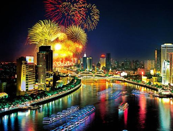 珠江河上11座橋:人民橋、海珠橋、海印橋、洛溪大橋、珠江大橋、廣州大橋,還有新建的解放大橋、江灣橋、華南大橋、鶴洞大橋,和獵德大橋,以及珠江過江隧道,把珠江南北兩岸和芳村區(qū)連成一片;兩岸星級賓館、商廈林立:白天鵝賓館、華廈大酒店、南方大廈、愛群大廈、廣州賓館、廣信江灣大酒直聳云天;夜晚,兩岸燈火璀璨,明月高懸,“珠江夜游”游輪載著滿船游客自西向東,輕泛珠江水,共奏歡樂曲。